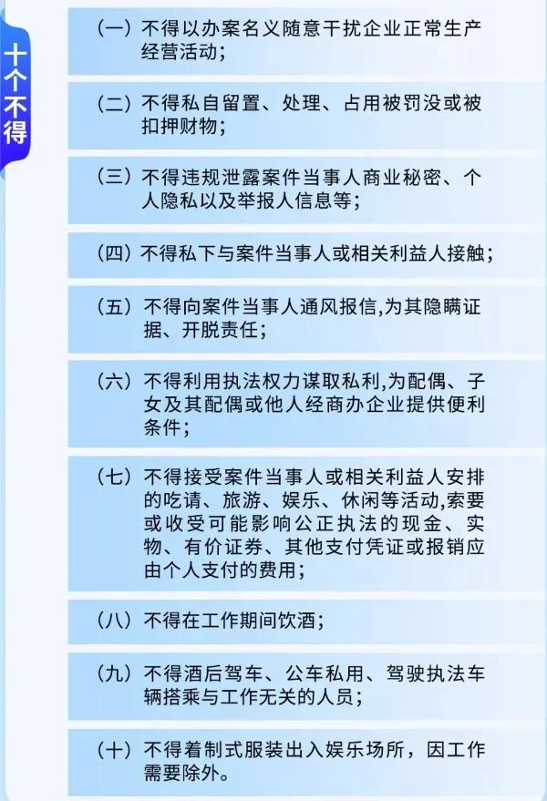 从去年开始,国家相关部门就明确表态要规范执法行为。市场监管总局迅速响应,发布《关于牢固树立监管为民理念 推行服务型执法的指导意见》和《市场监管执法行为规范》。其中,《市场监管执法行为规范》对市场监管执法人员的行为进行了全方位的规范,从作风纪律、仪容举止,到执法用语和案件办理流程,均提出明确且严格的要求。尤其是“八个严禁、十个不得”规定,剑指随意执法、趋利执法等各类执法乱象,为执法人员划出了清晰的行为红线,要求执法人员坚决杜绝此类问题。