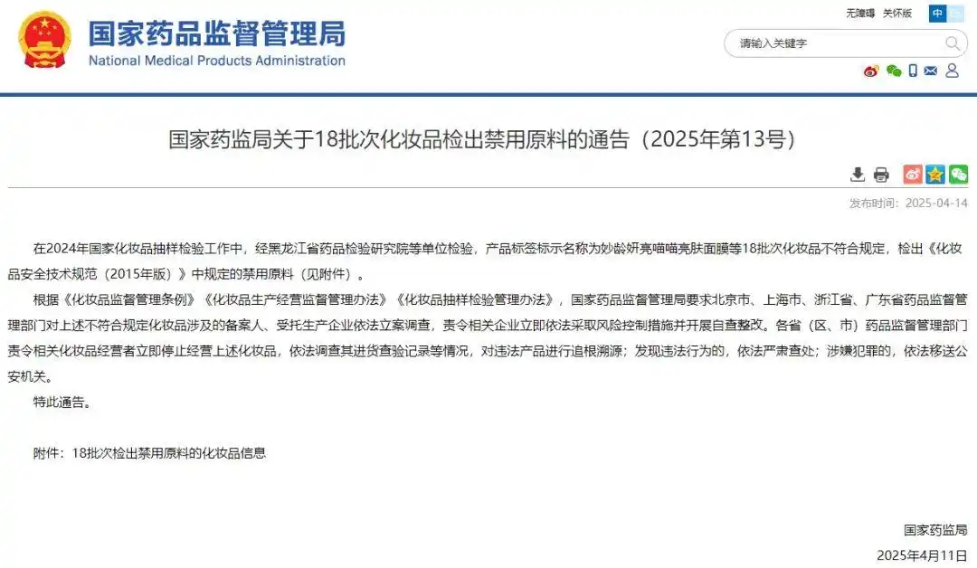 国家药监局昨日(14日)发布通告称,在2024年国家化妆品抽样检验工作中,经黑龙江省药品检验研究院等单位检验,产品标签标示名称为妙龄妍亮喵喵亮肤面膜等18批次化妆品不符合规定,检出《化妆品安全技术规范(2015年版)》中规定的禁用原料。
